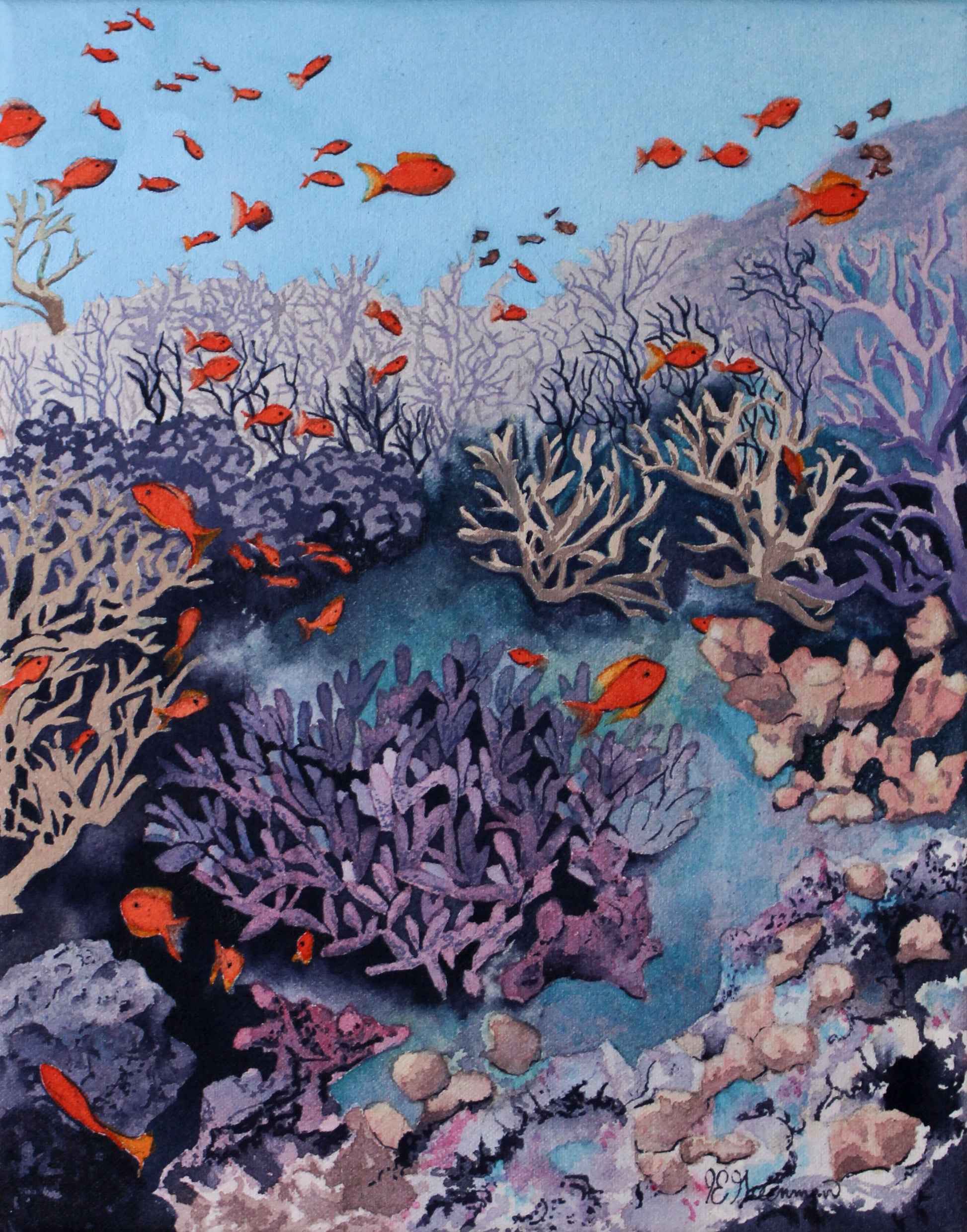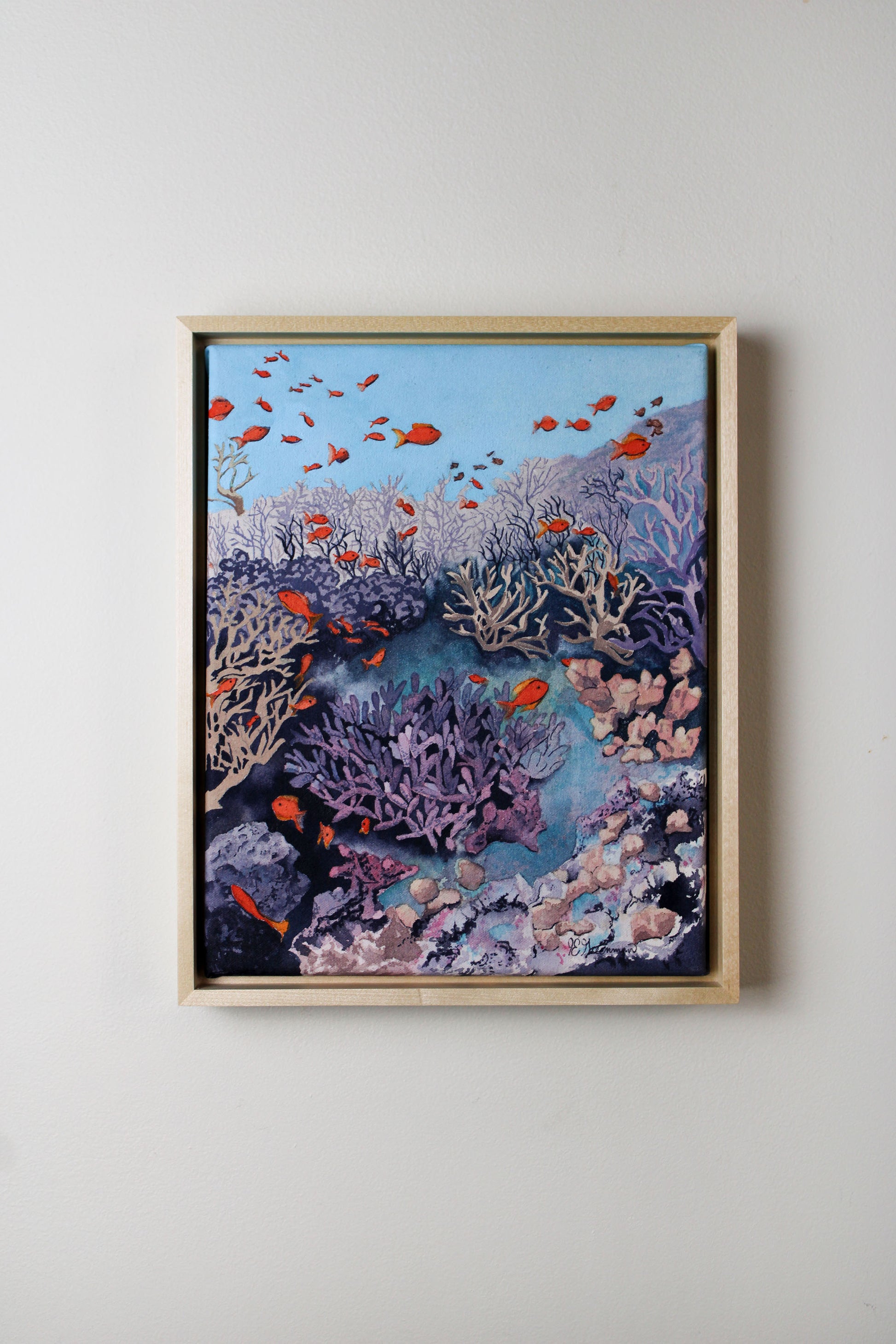 An Original 8x10" watercolor painting framed on canvas. This piece was created on stretched canvas using transparent medium ground, so the canvas texture would remain visible after painted. The piece will arrive professionally mounted within a floating maple frame and with a Certificate of Authenticity. This piece is part of my creation series, showing day five of creation where God created the fish and birds.